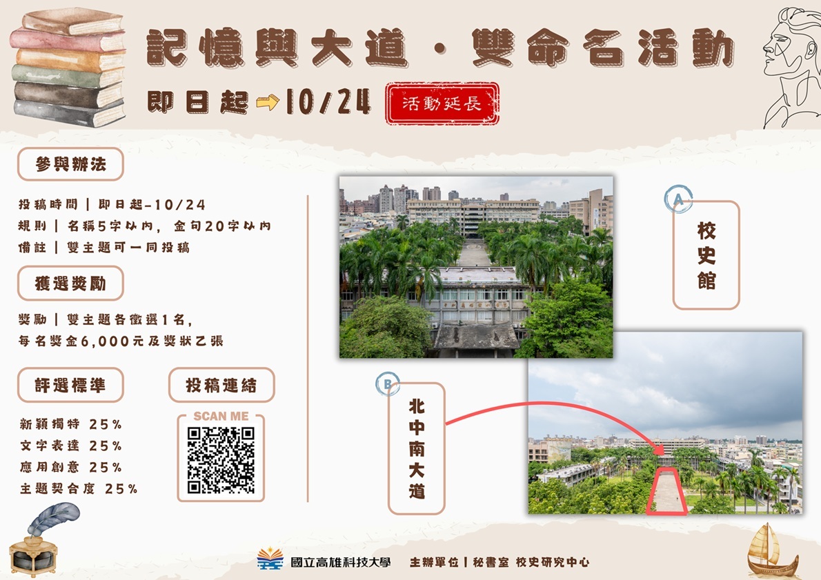 【公告】國立高雄科技大學校史館及北中南大道命名徵選活動辦法(延長收件至10月24日止)